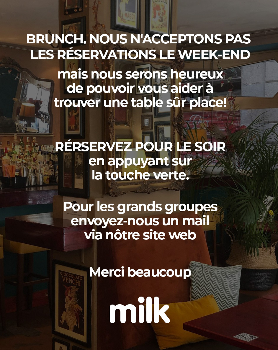 Au printemps 2005, Rebecca et moi sommes arrivés de San Francisco, en Californie, pour apporter notre vision de ce que nous pensions être le bar/restaurant parfait pour nous. Un endroit où nous pourrions tous nous y retrouver… D’où la naissance du “Milk brunch · tapas · bar”. Célèbre pour le meilleur brunch de Barcelone.